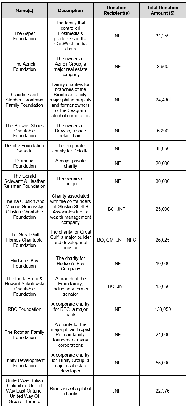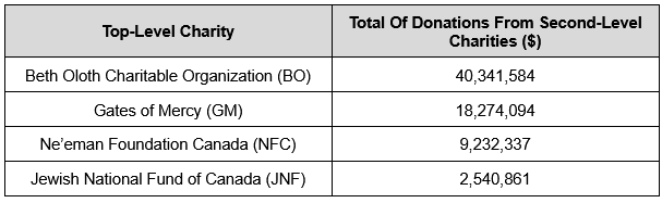 As a refresher: “top-level charities” refers to charities that, according to the Canada Revenue Agency (CRA), contributed to at least one of the following aspects of the Israeli occupation of Palestine: the illegal settlements and the military; “second-level charities” refers to charities that donated to the top-level ones during the calendar years of the audit period upon which the CRA revoked its charitable status.