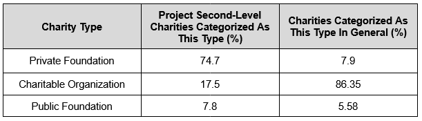 The project’s breakdown was significantly different from the general breakdown of charities in Canada. The most notable difference is the 66.8 percentage point disparity in the makeup of private foundations, which demonstrates that the charities involved in this project are far likelier to be started and funded by private families than Canadian charities in general.