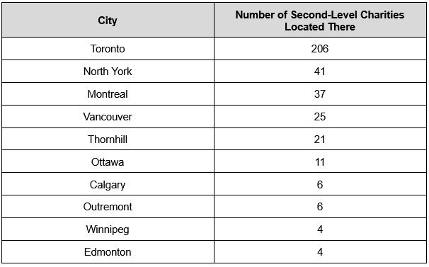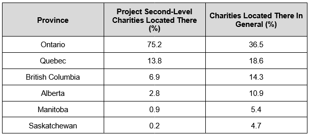 A geographic breakdown of the second-level charities by their mailing addresses revealed that Ontario was drastically over-represented when comparing the percentage of second-level charities within it (75.2 per cent) to the percentage of charities based in the province in general (36.5 per cent) as of 2023. Every other province, meanwhile, was underrepresented to some extent, sometimes drastically, or did not appear at all.