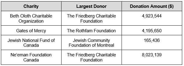Finally, all seven of the schools included among second-level charities were Jewish ones, ranging from elementary schools to universities. Together, these Jewish schools cumulatively donated about $301,149 to top-level charities.