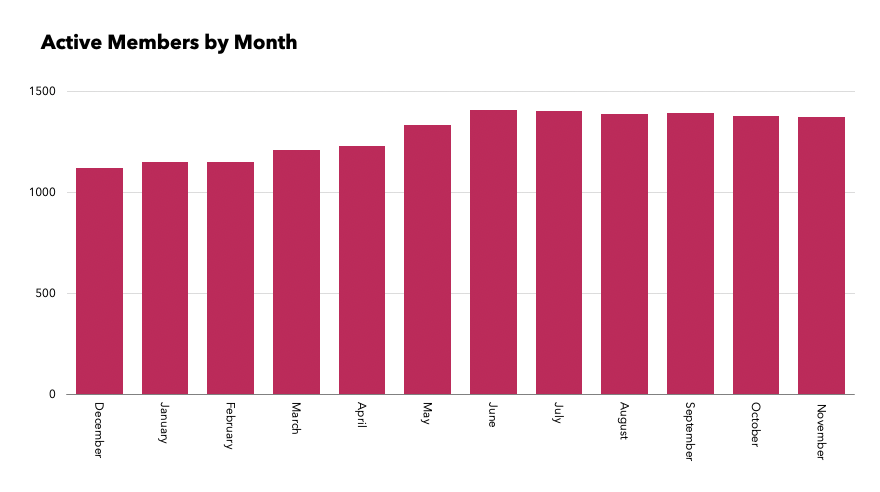 The amount of revenue each month has varied throughout the year, with new members joining and some cancelling. As of November 30, the last day included in this report, we had 1,370 active paying readers at a variety of membership levels (+469 members from before last year’s December membership drive), as well as having received $697 in donations (-$434 from last year.)
