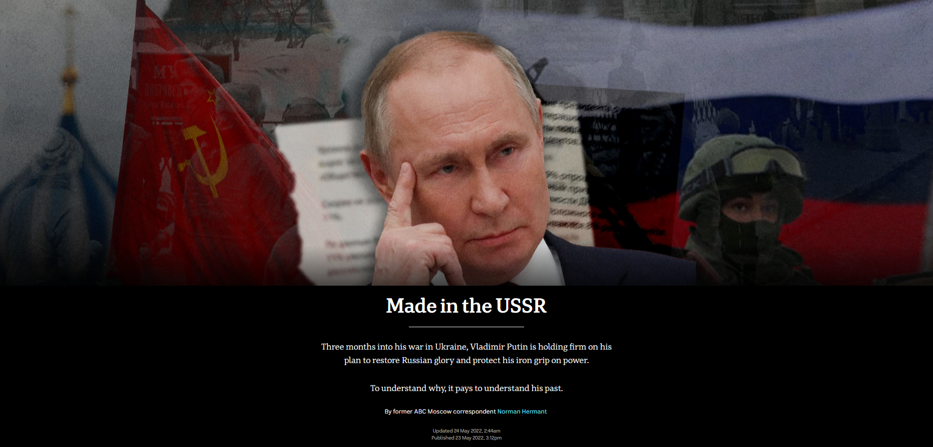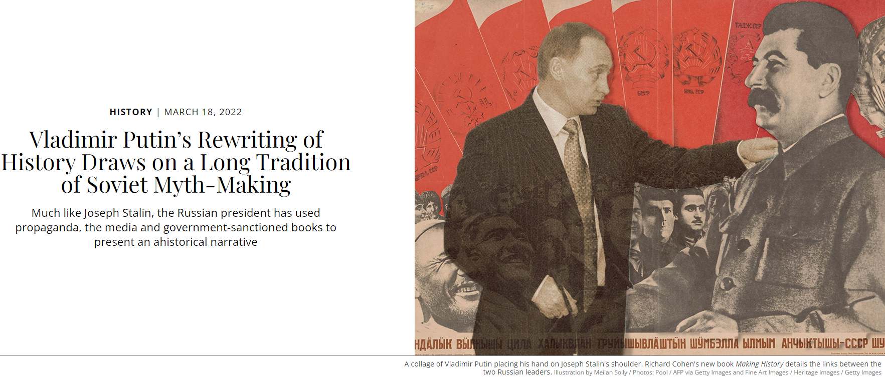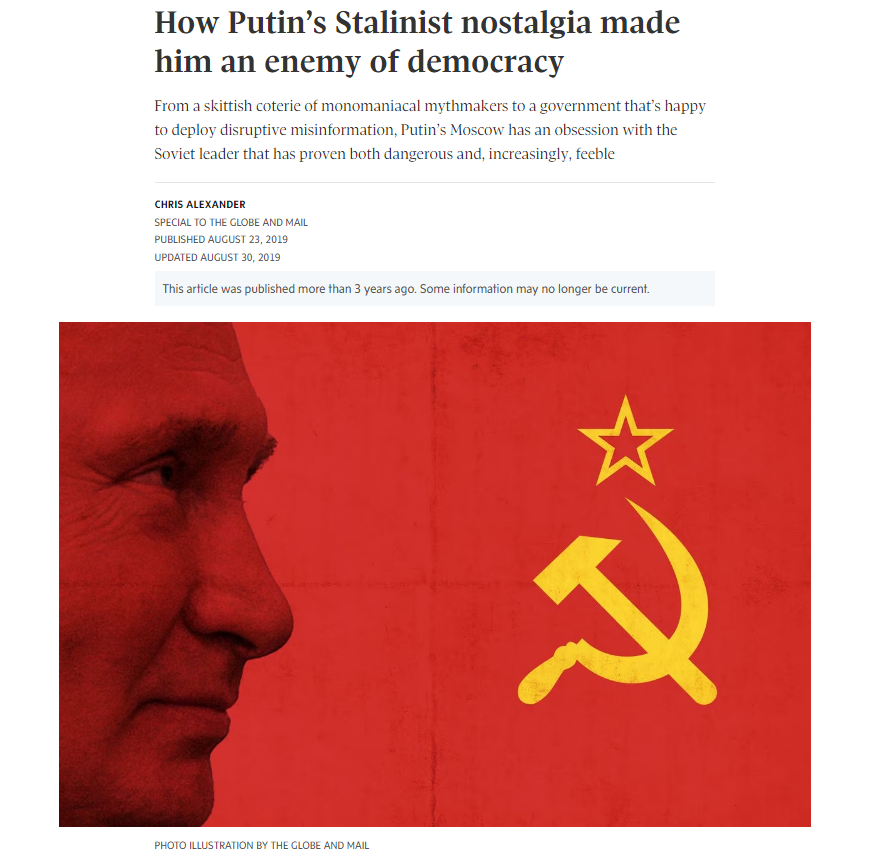 A Jan. 11, 2017, article from The Globe and Mail, for example, was titled, “Russian ‘dezinformatsiya' throws U.S. politics into chaos.” A March 9, 2017, editorial from the Toronto Star, meanwhile, claimed that concerns about then-Minister of Foreign Affairs Chrystia Freeland’s affinity for right-wing forms of Ukrainian nationalism were “the type of misleading dezinformatsiya (disinformation) that Russian sources have trafficked in for years, during and after the Soviet era.” Reporting since then, in Canada and abroad, has also routinely equated Russia with the Soviet Union, including through its use of manipulated imagery, with examples (included as screenshots below) seen in The Globe and Mail (Aug. 23, 2019), Smithsonian Magazine (March 18, 2022), Washington Post (May 9, 2022) and ABC (May 23, 2022).