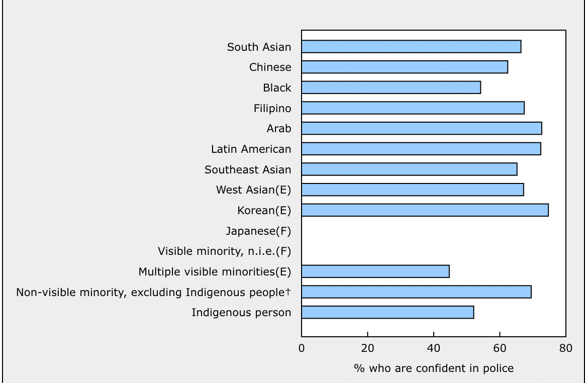 According to the 2020 GSS, one in five Black people aged 15 and older reported having little or no confidence in police — double the proportion reported by non-Indigenous, non-visible minority people, of whom 11 percent said they had little or no confidence in police.