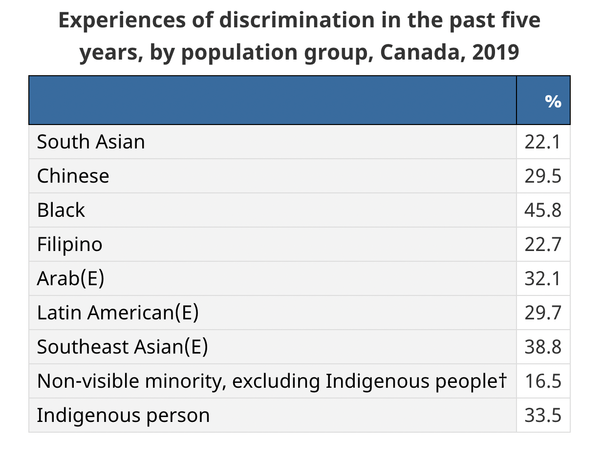 Stat Can notes: “Recently, social movements seeking racial and social equity in response to injustice—both current and historical—have demonstrated the importance of measuring and monitoring the perceptions and experiences of diverse populations.”