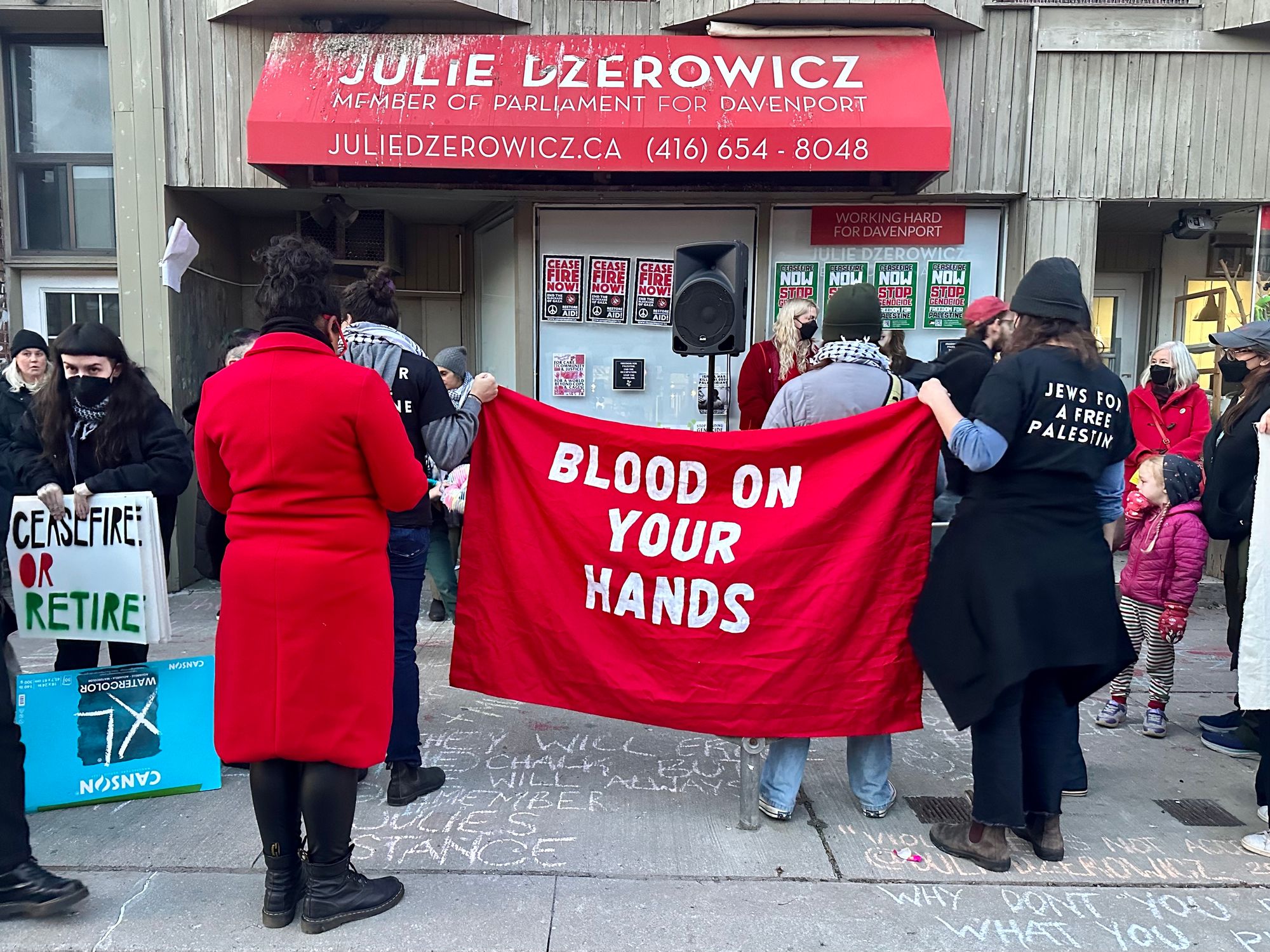 Virani did not show up at his office during the protest. The demonstrators blocked the entrance to the office with banners reading “blood on your hands” and “Parkdale demands a ceasefire.”