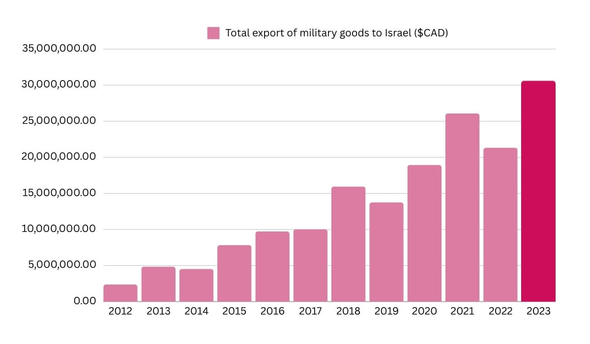 Over the past 10 years alone, annual Canadian exports of military goods to Israel have increased more than sixfold from $4.8 million in 2013.