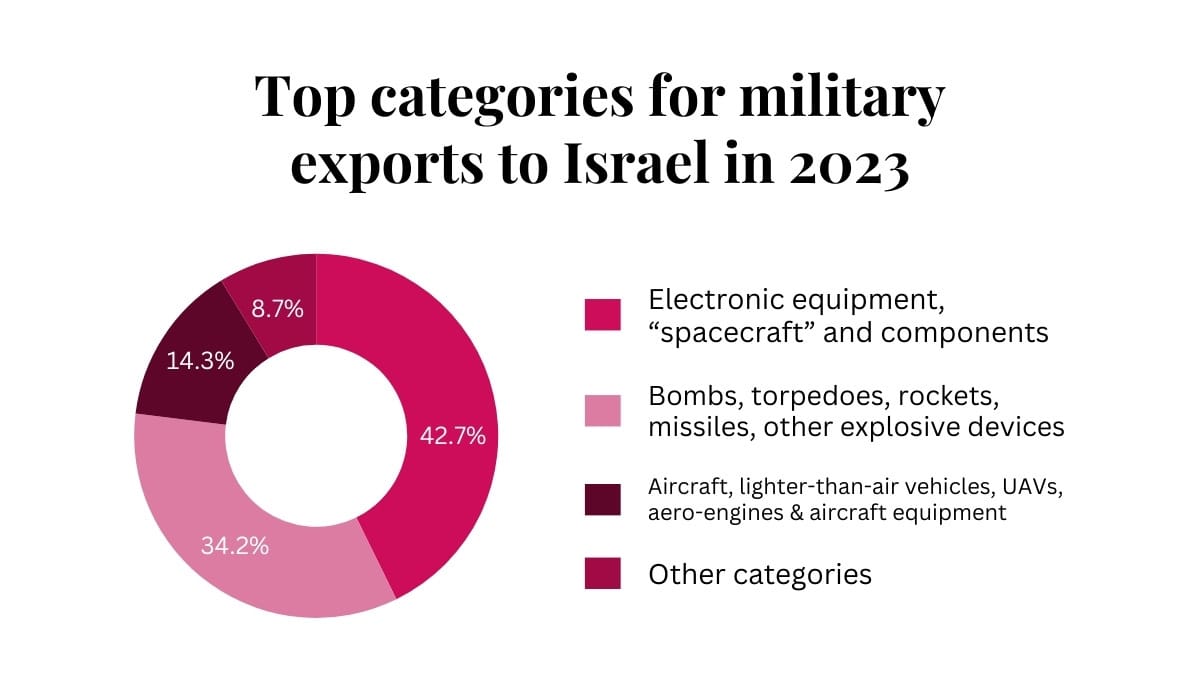 GAC discloses only very broad strokes about the nature of the military goods being sold abroad. Below is a breakdown of the export categories of goods that were exported to Israel last year.