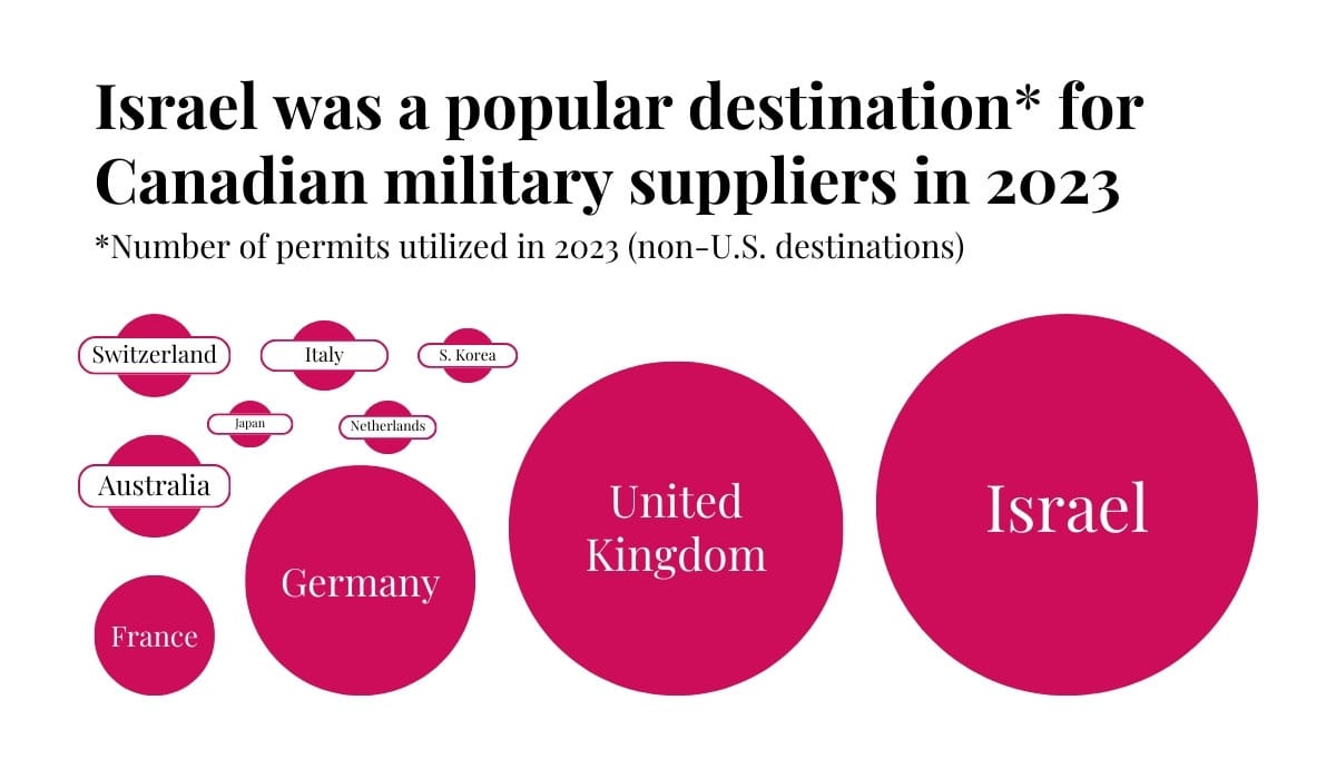 Israel was the non-U.S. destination with the highest number of military export permits utilized by Canadian suppliers in 2023. This does not mean, however, that Israel purchased the highest dollar amount of Canadian military goods last year.