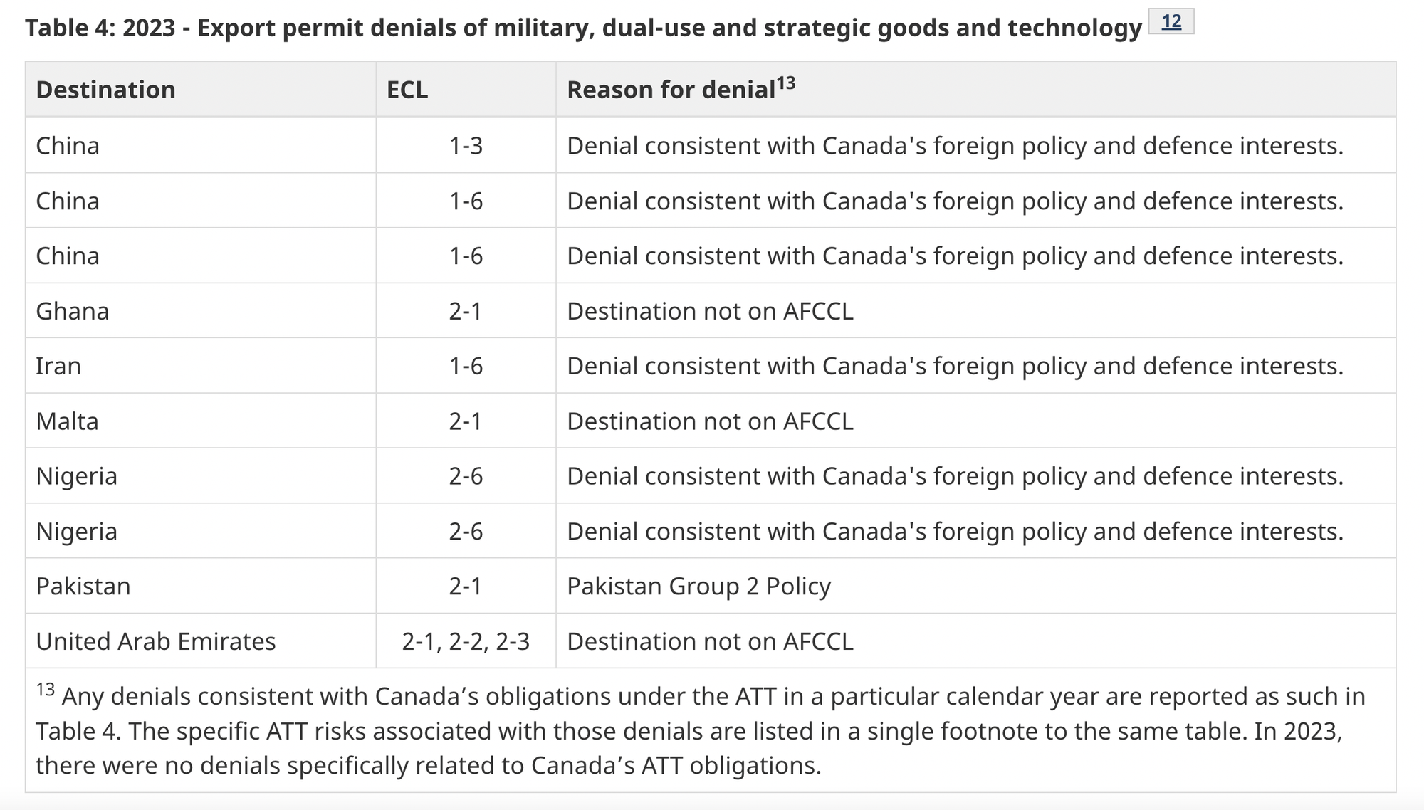 None of the military export permits that GAC denied last year were for exports of goods to Israel. Below is a table of the permit denials, and the reasons given for doing so.