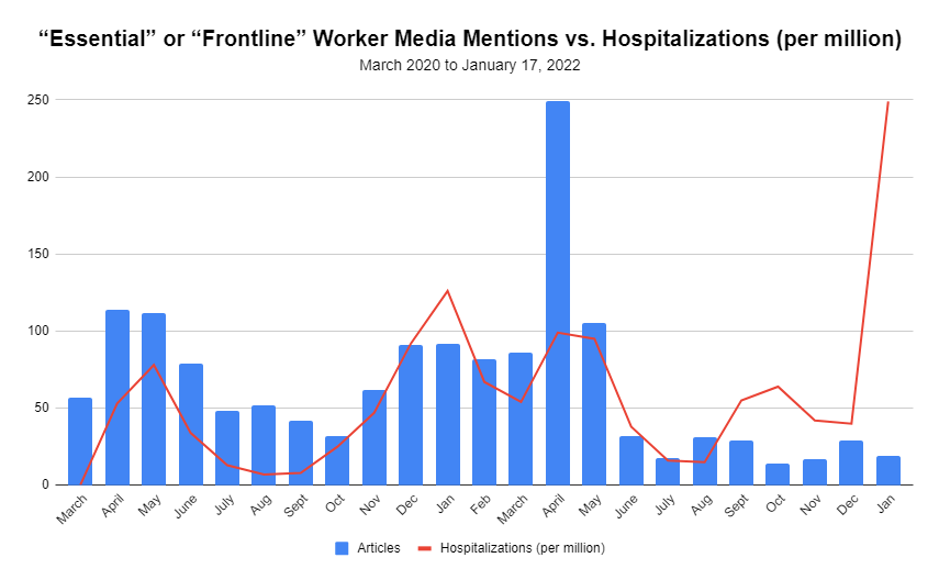 Starting in about September 2021 though, things started to shift dramatically in the other direction: hospitalizations increased and then skyrocketed, but the use of the phrase “essential workers” or “frontline workers” plummeted.