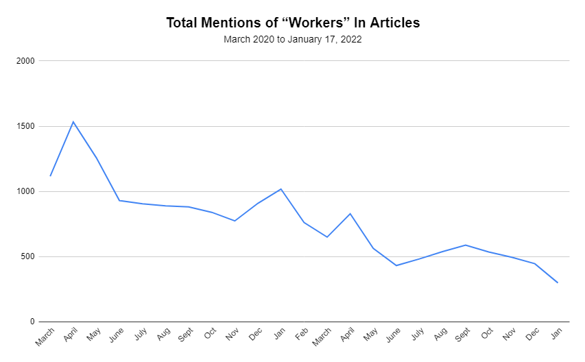 So: the number of articles mentioning workers is down; the use of the phrases “frontline workers” or “essential workers” is down; the percentage of mentions of “frontline” or “essential” as modifiers to “workers” is down. (I’ve included a graph below showing the decline of the number of mentions of “workers” in general in these publications throughout the pandemic.)