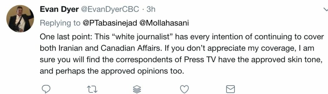 Shortly after I agreed, it became clear the panel was an ambush. Both of the other guests had supported United States President Donald Trump’s Iran policy. Meanwhile, the guest host, Evan Dyer, had uncritically quoted fringe elements of the diaspora in his past reporting, and told Iranian Canadians to watch Iranian state TV if they didn’t like his coverage. I raised these concerns with the associate producer, but was told the panel composition wouldn’t change.