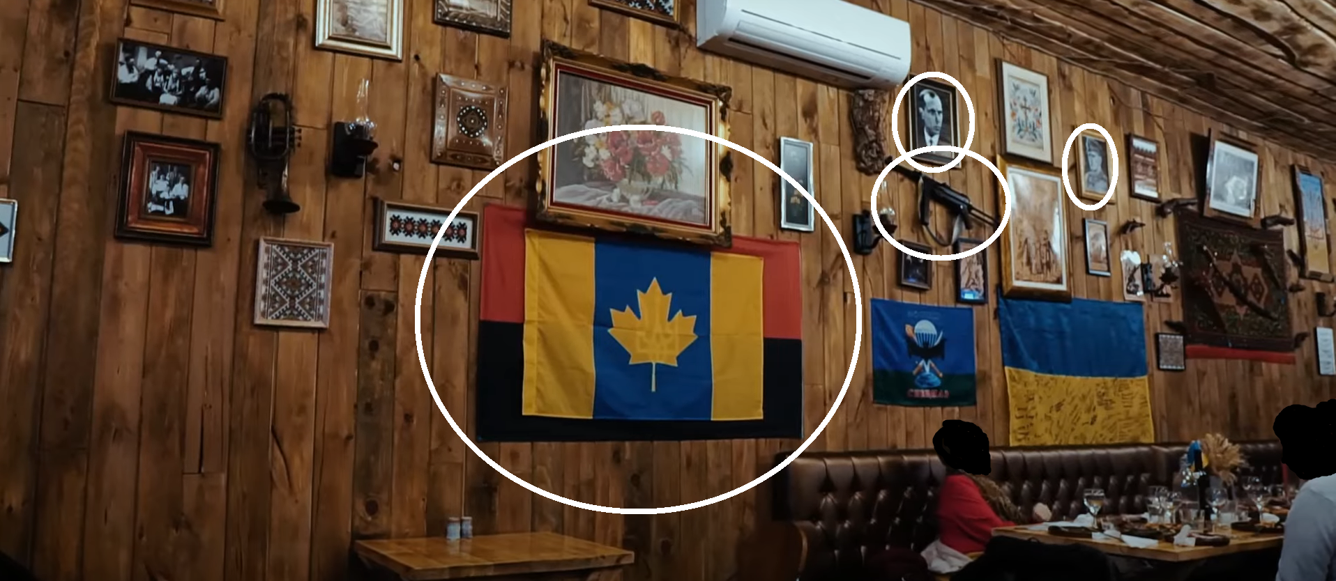The closest we get to any discussion of the restaurant’s decorations is a CBC article published in August. The article features a few photos of the restaurant and its owner, which clearly include the red and black UPA flag as well as the MP40. Despite this, the flags are ignored in the article and its photo captions. A February article at the Toronto Sun notes that “flags drape the walls,” but doesn’t describe any of them. One of the flags is also visible in the back of a BlogTO video shot in the restaurant, but it’s not mentioned by the host.