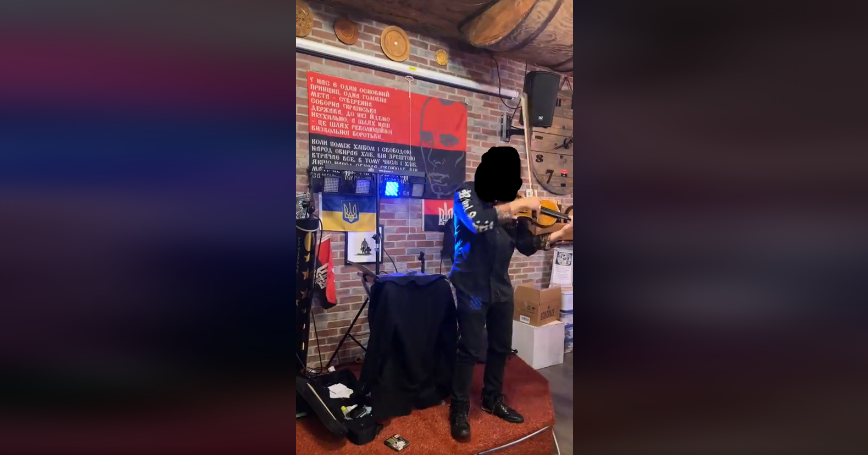 The restaurant’s walls are adorned with the following: several Ukrainian Insurgent Army (UPA) flags, a flag with UPA colours and Stepan Bandera’s face on it, portraits of Bandera and Roman Shukhevych, and an MP40. The restaurant also runs a gift shop, which sells a range of items including a Bandera flag, a UPA flag and car flag, and a UPA car hood cover.