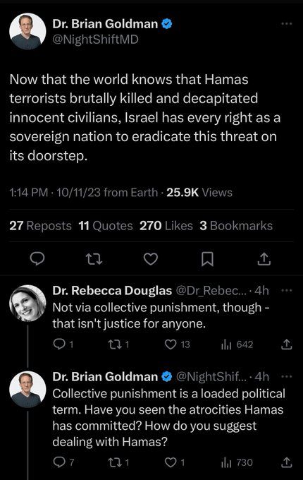 Goldman then responded: “Collective punishment is a loaded political term. Have you seen the atrocities Hamas has committed? How do you suggest dealing with Hamas?” - Source: Twitter (since deleted)