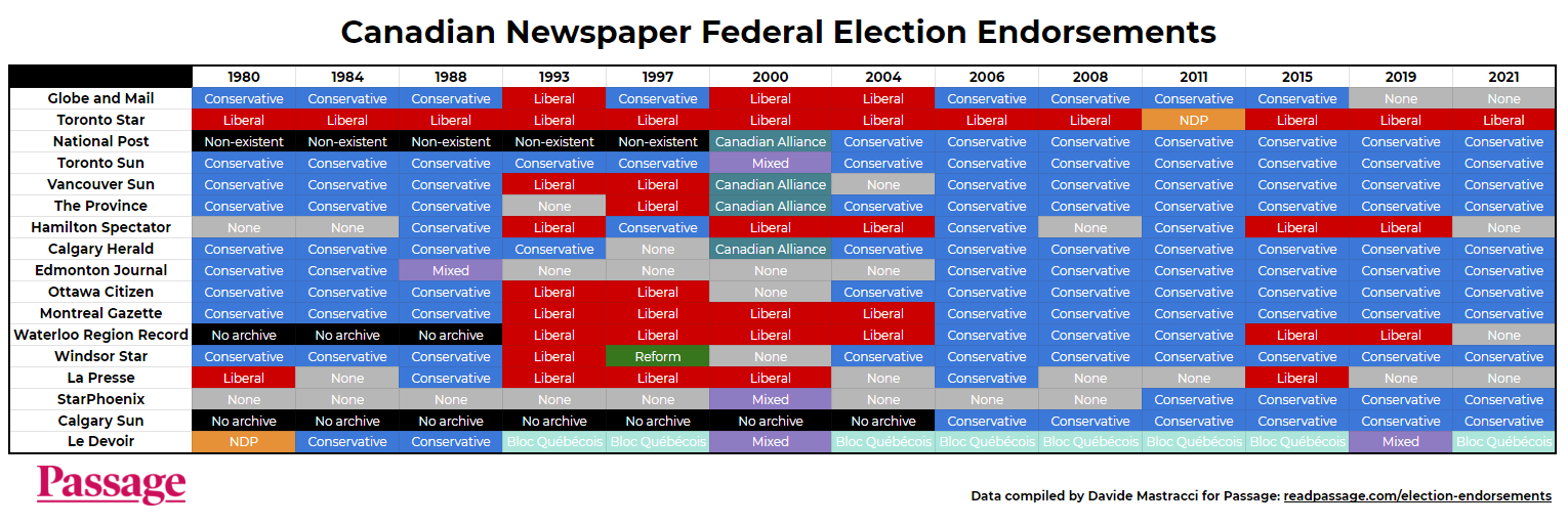 I’ve compiled the editorial endorsements of 17 newspapers for the past 13 elections: 1980, 1984, 1988, 1993, 1997, 2000, 2004, 2006, 2008, 2011, 2015, 2019, 2021.