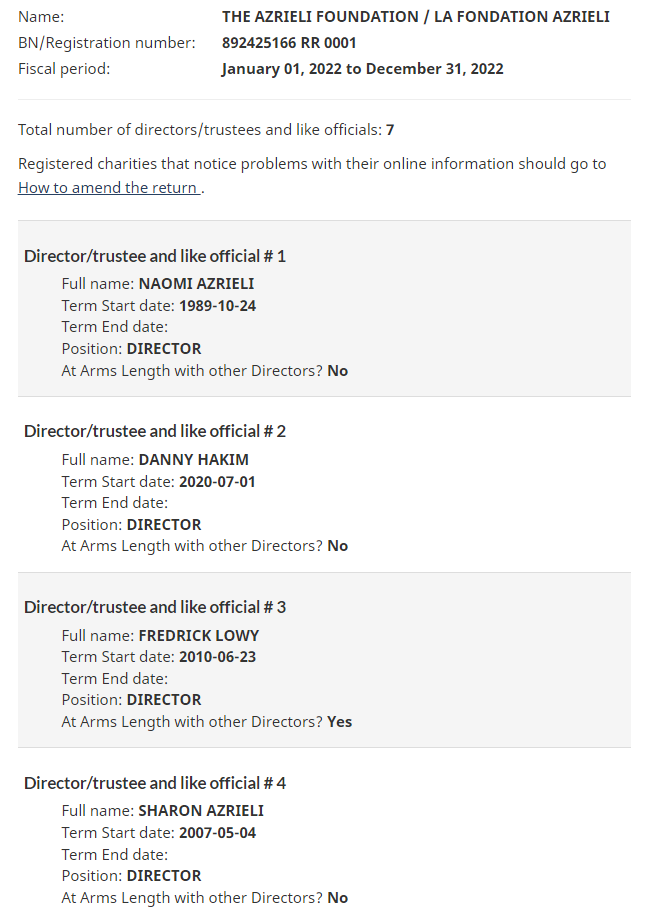 As of 2022, the Azrieli Foundation (AF) had total assets of more than $2.4 billion. Two of its directors, Sharon and Naomi Azrieli, and one of its former directors, Danna Azrieli, are billionaires according to Forbes’ listing of their real-time net worth.