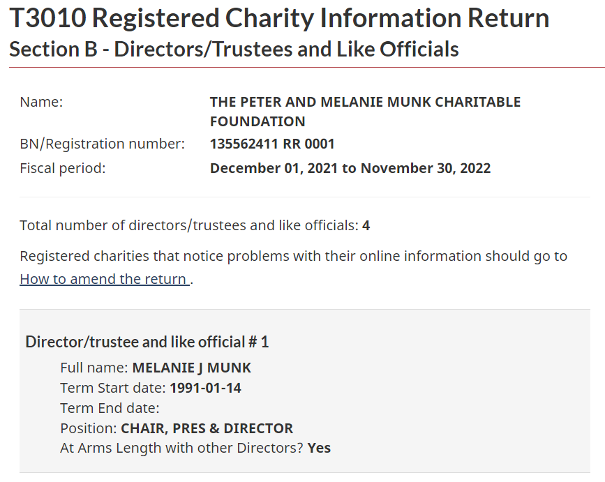 The Munks are well known for their various donations, including to the Munk School of Global Affairs at U of T, and for founding the Munk Debates. The chair, president and director of the foundation is Melanie Munk, wife of the late Peter Munk, who died in 2018. Peter is the founder of Barrick Gold, the largest gold mining company in the world. The New York Times obituary for Peter notes that there were “few good estimates” of his net worth, but that he “led the life of an international billionaire” and “his associates included Prince Charles; fellow billionaires [...] and Brian Mulroney.” Forbes notes that as of 2023, Barrick Gold had assets of around 46.2 billion USD.
