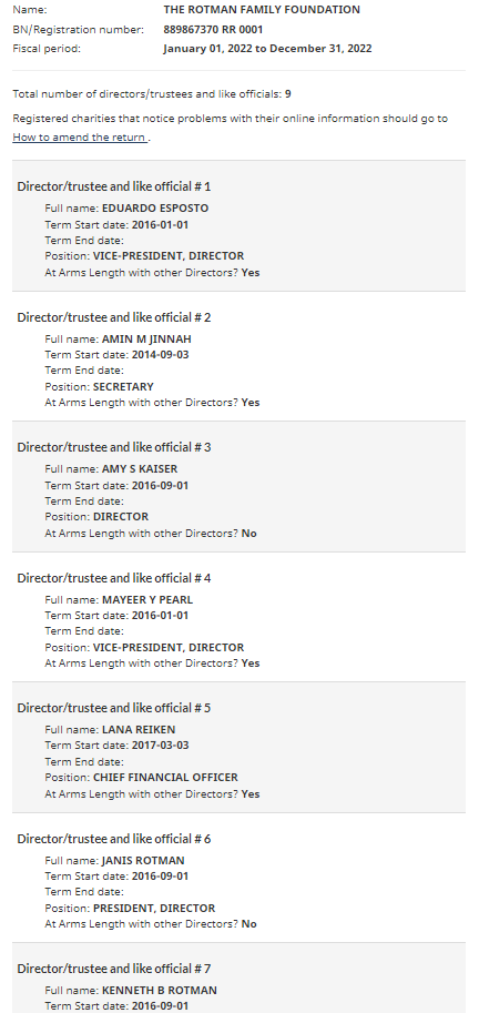 The Rotman Family Foundation, which had total assets of nearly $10 million in 2022, made a $12,500 donation to HRC in 2020. One of HRC’s co-founders, Ken Rotman, is a member of the Rotman family and a director at the foundation. A biography for the Rotman family on the website for U of T’s “Chancellors’ Circle of Benefactors” notes that it donated more than $100 million to the university and health-care institutions affiliated with it alone. Joseph, it states, was “the founder of many companies, including Roy-L Capital Corporation, Tarragon Oil & Gas and Clairvest Group Inc. [and] served on the boards of Bank of Montreal, Barrick Gold Corporation, and numerous energy firms.” The Maple sent several emails to Ken Rotman’s work address and also called his work number and left a voicemail. Rotman didn’t respond to any of these messages.
