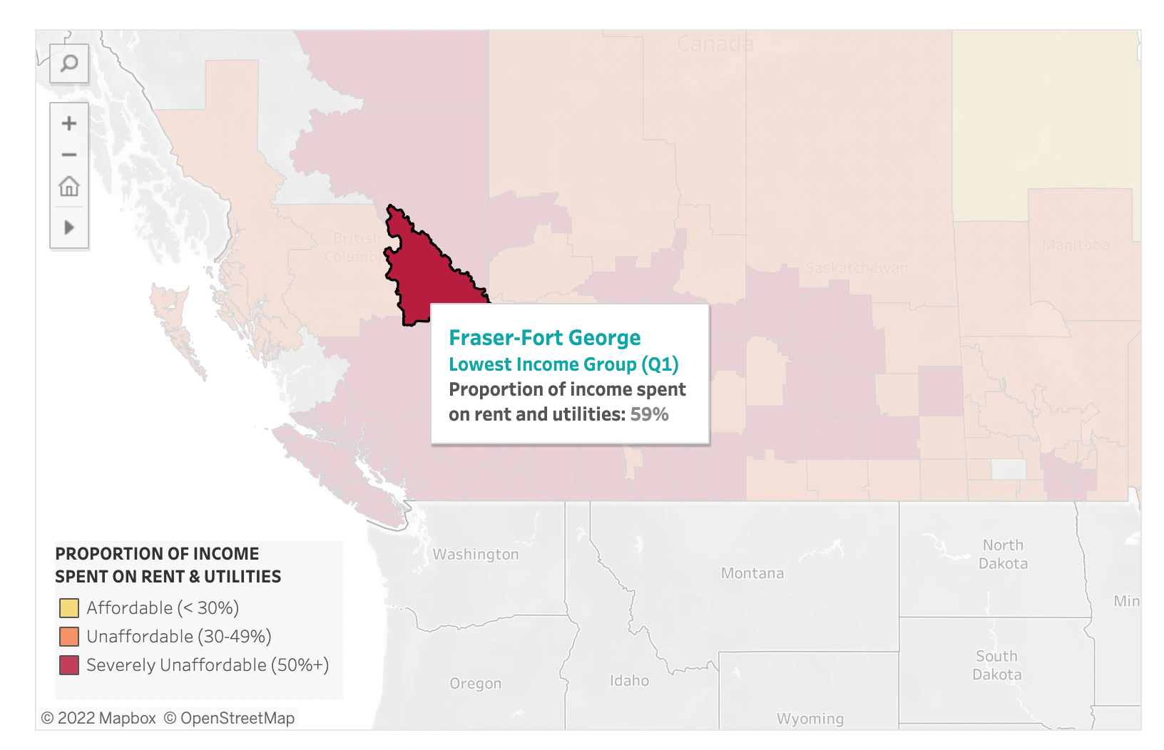 What we found: According to the Canadian Rental Housing Index, the regional district of Fraser–Fort George, which encompasses the City of Prince George, ranks as “unaffordable” for low-income residents. Those in the lowest-income group need to spend an average of 59 per cent of their income on rent and utilities.