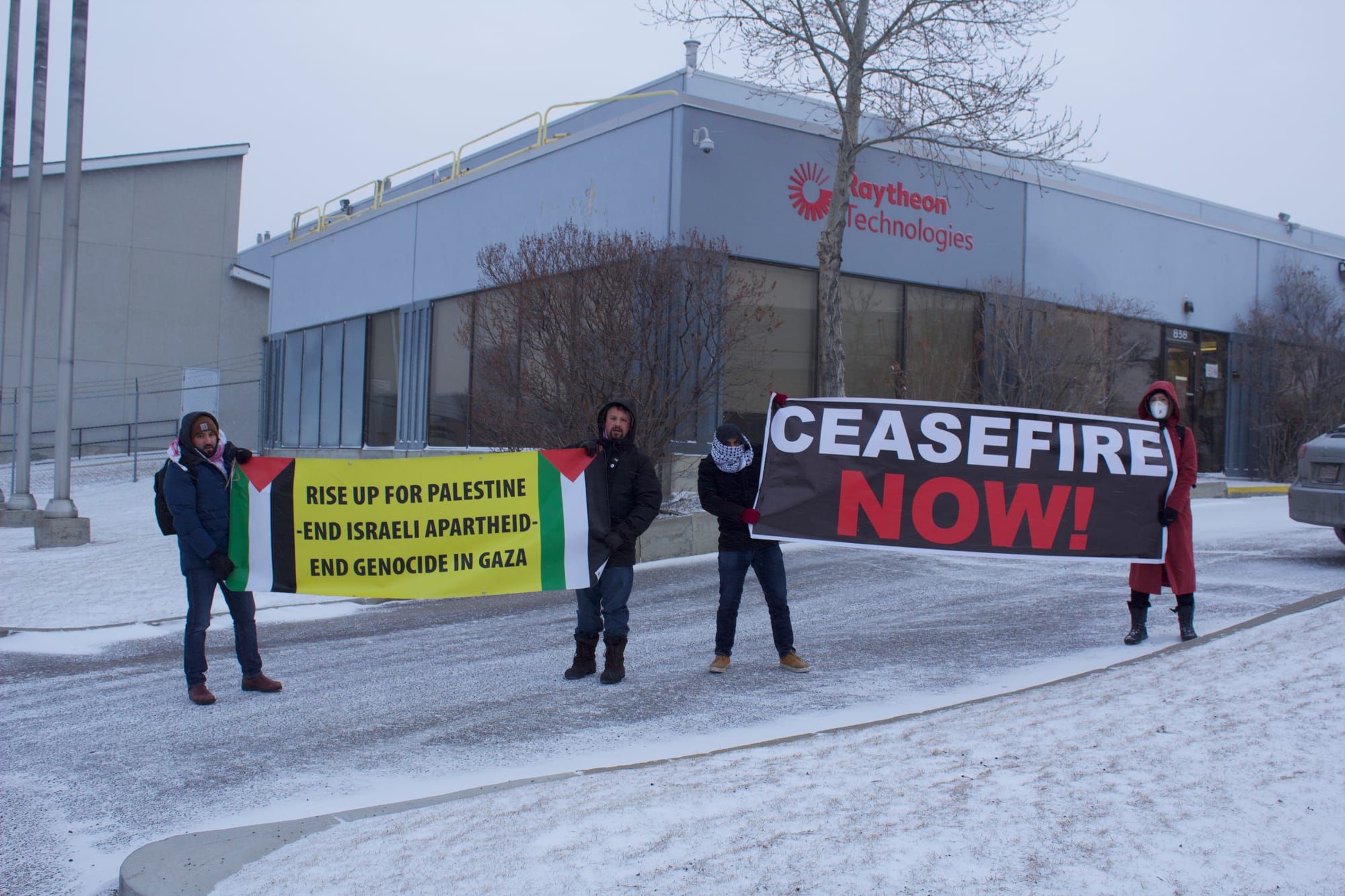 A small group of protesters in Calgary gathered at the local office of American weapons manufacturer RTX, formerly known as Raytheon, early on Monday morning.