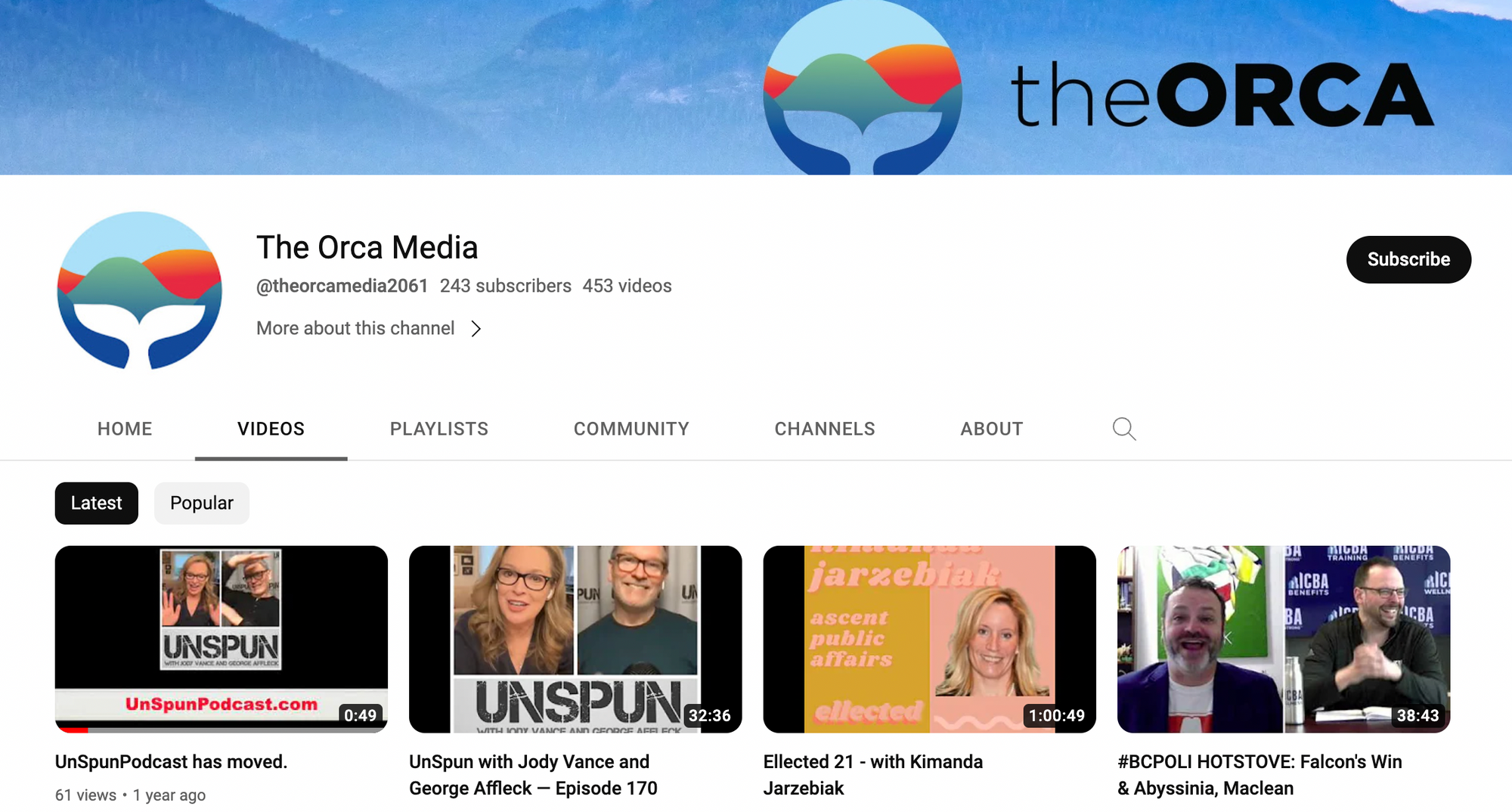 Alongside its opinion columns, the publication’s regular content included YouTube shows hosted by right-wing political partisans like Jordan Bateman, vice-president of the anti-union Independent Contractors and Businesses Association (ICBA), and George Affleck, a former NPA councillor and BC Liberal candidate. The shows appeared to have extremely limited uptake, with episodes often fetching under 100 views each. The Orca's YouTube channel stopped broadcasting these shows following Kay’s departure last year.