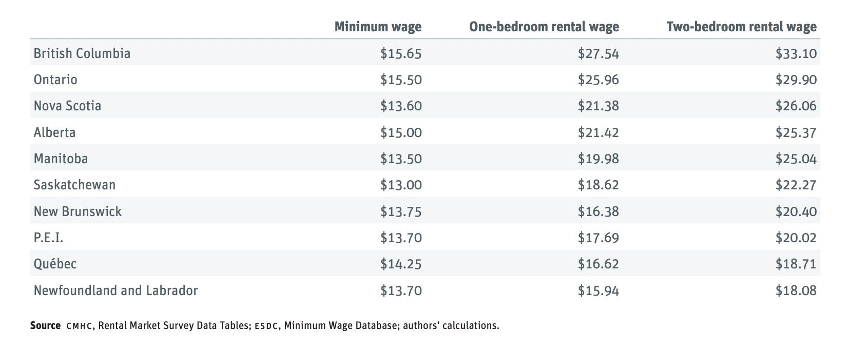In British Columbia, the "rental wage" for a two-bedroom unit is more than double the minimum wage of $15.65 per hour, which is the highest in the country. The gap between the minimum wage and rental wage for a one-bedroom rental unit is almost $12.