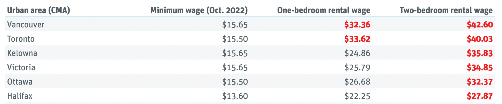 In Vancouver, Toronto, Kelowna, Victoria, Ottawa and Halifax, the rental wage for a two-bedroom unit is more than twice the provincial minimum wage in each city.