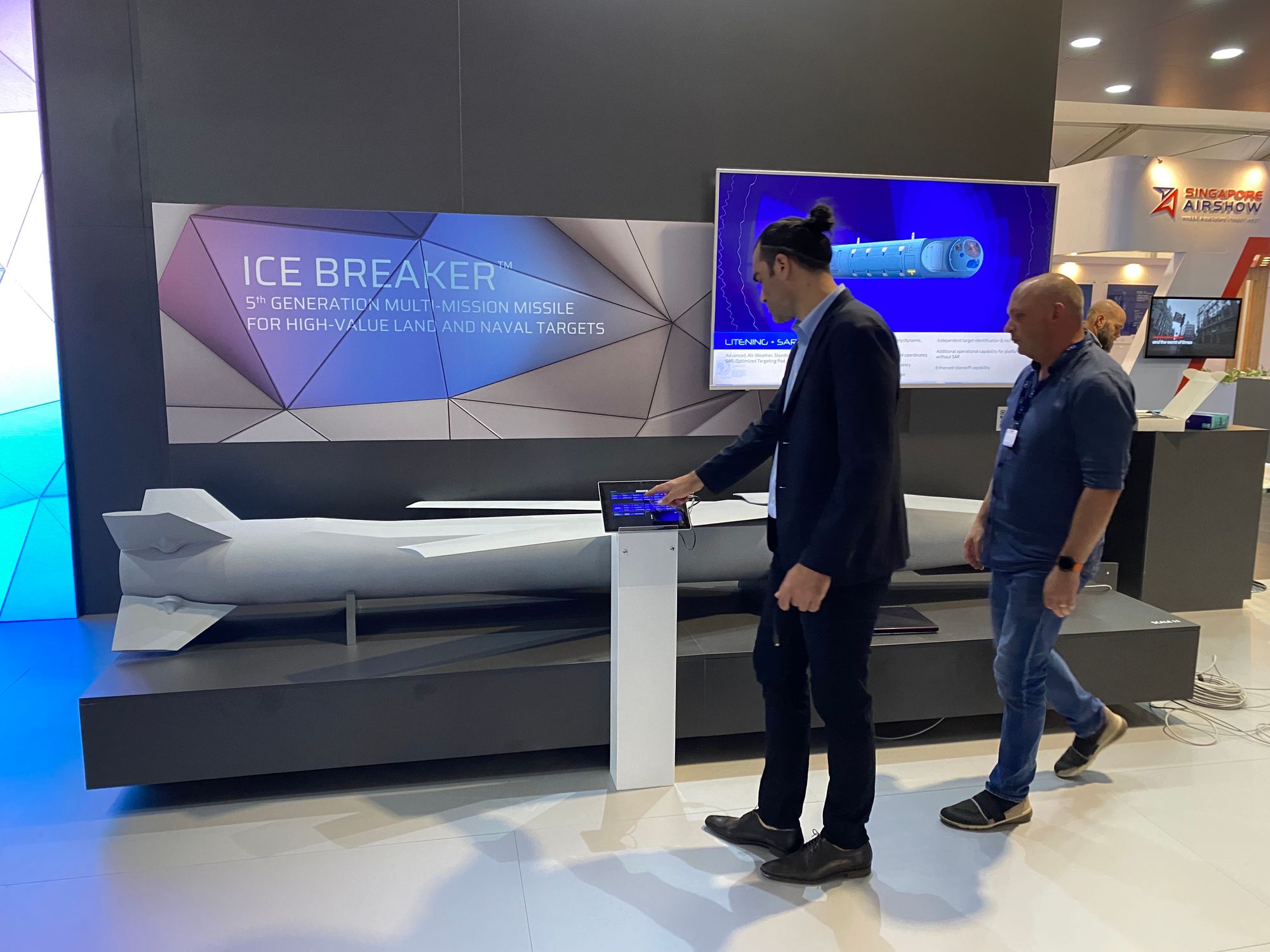 Israeli state-owned weapons manufacturer RAFAEL was at the show marketing its recently unveiled “Ice Breaker” missile system.
