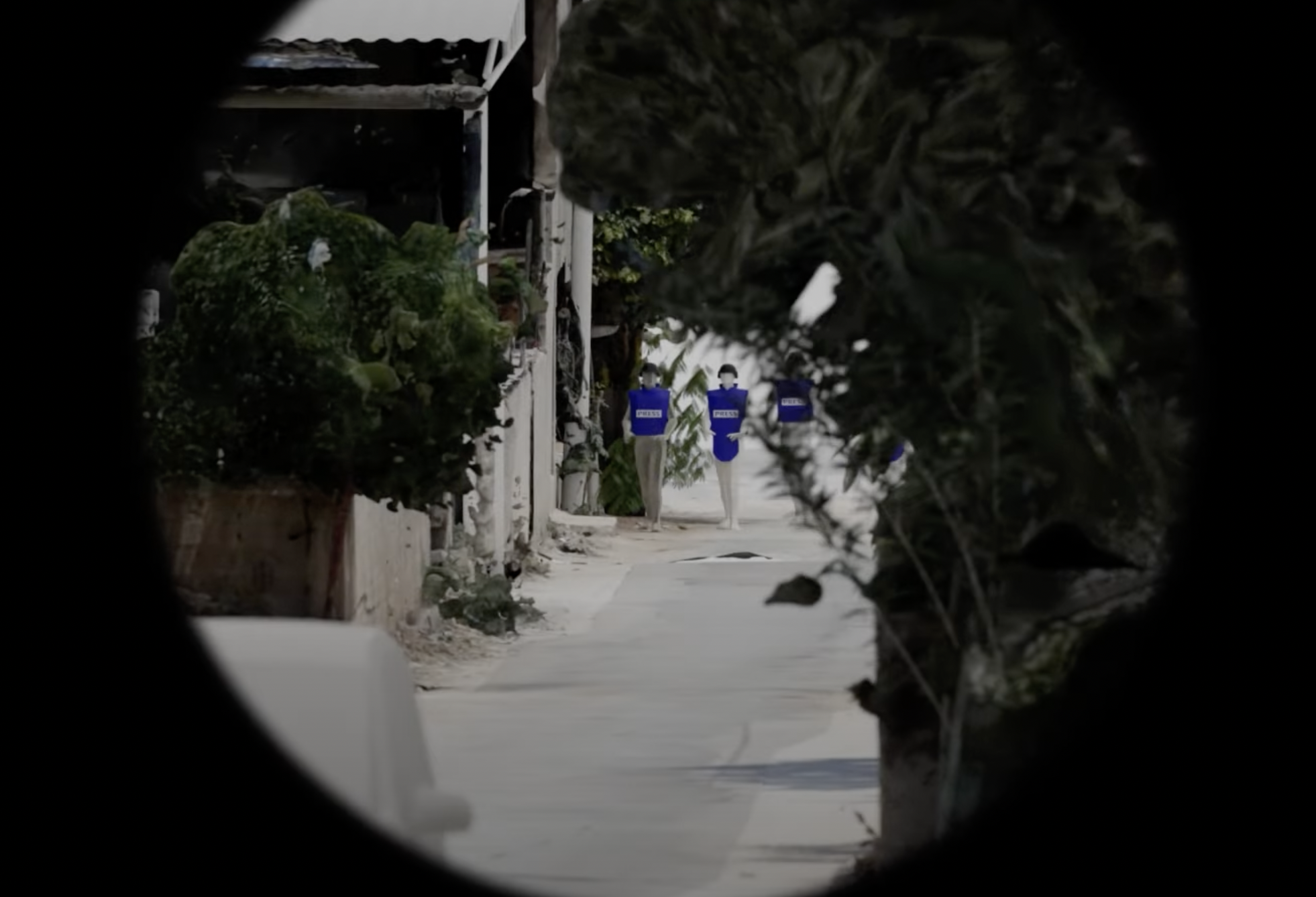 Screenshot of Al-Haq/Forensic Architecture video/YouTube. Shows reconstruction of how journalists appeared in Israeli shooter's scope.