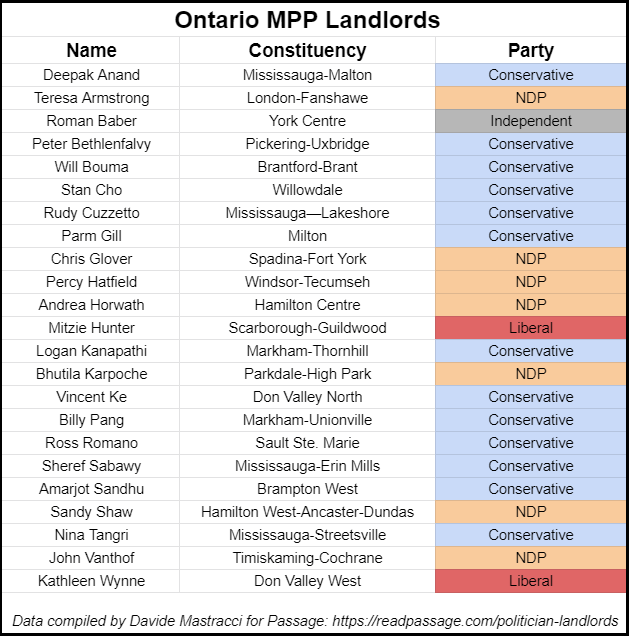 Last year I compiled a list of MPPs in the province who were (at the time) landlords of some sort. You can review that list now, and I will update it as soon as possible after the election. At the time I put it together, nearly 20 per cent of MPPs were landlords, according to disclosure statements.