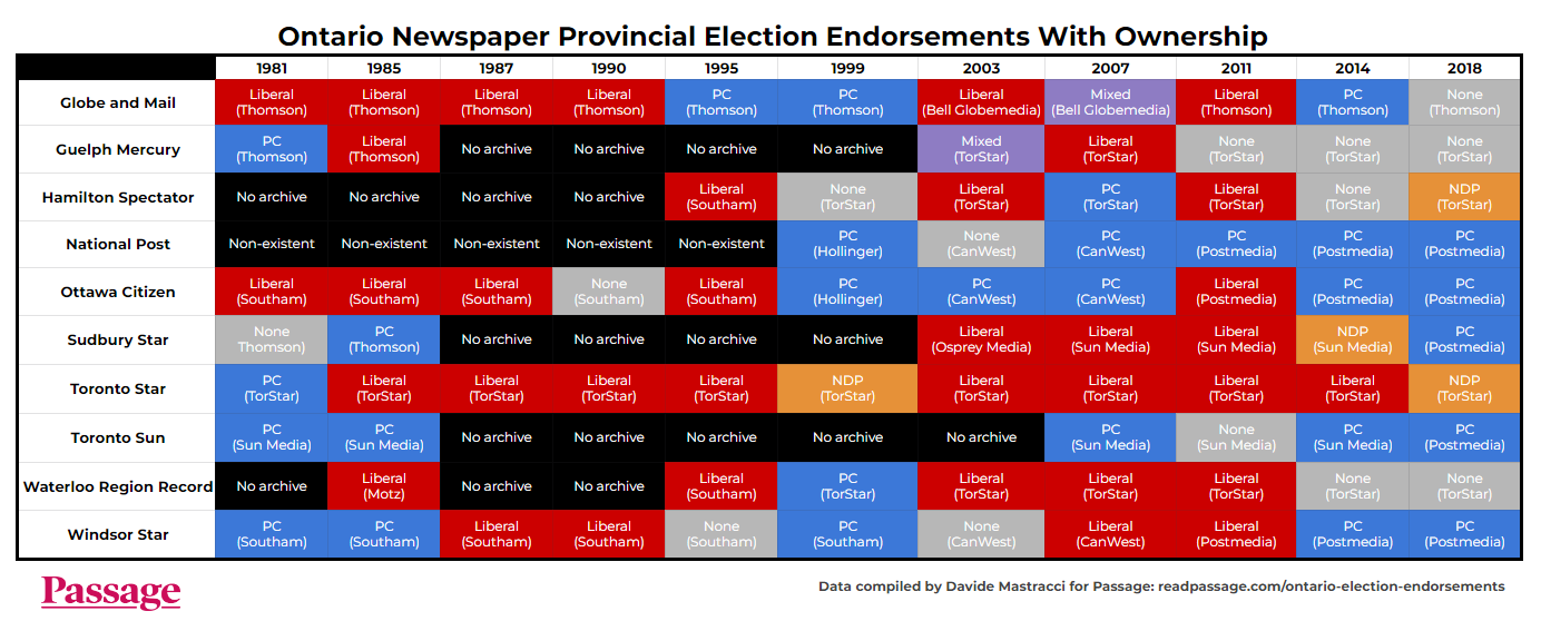 To be clear, this post shouldn’t be read as an endorsement for any party, as Passage doesn’t put out editorials. If you’re curious about who some of Ontario’s major newspapers have endorsed with editorials, however, you can take a look at this chart I compiled. It will be updated when the next round of editorials are published.