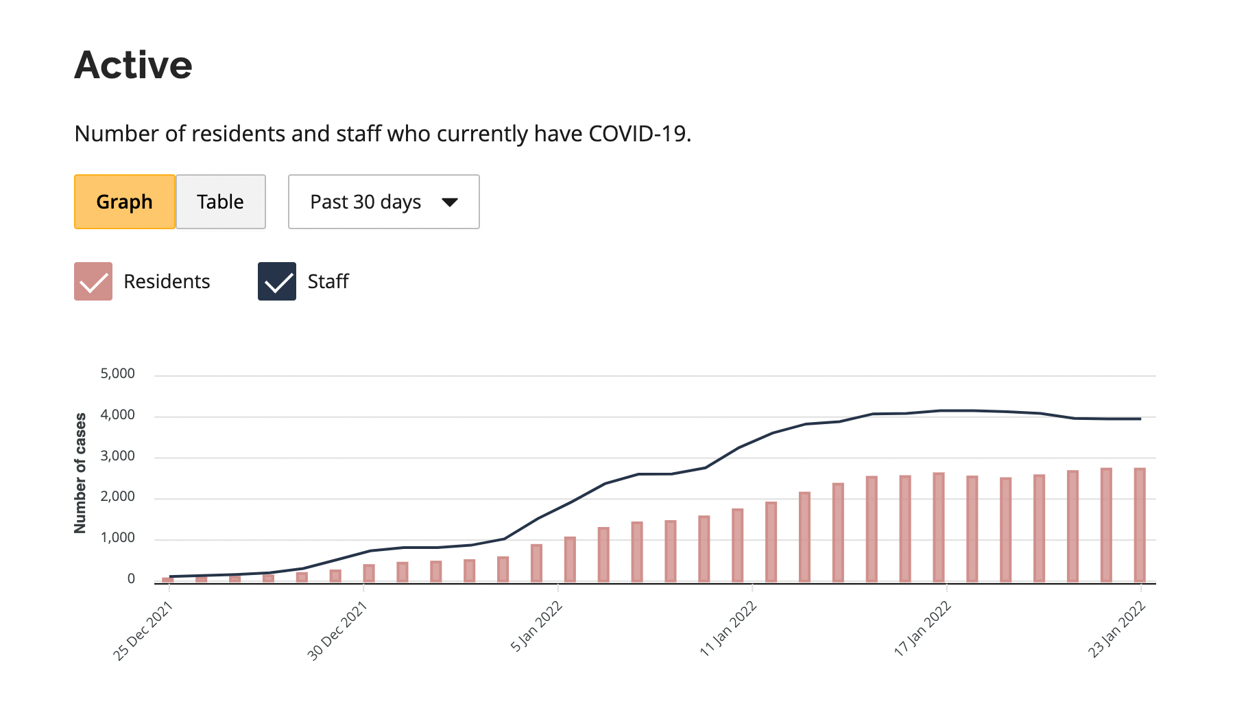 According to the most recently available health data from the Government of Ontario, there are currently 3,862 long-term care staff and 2,821 residents with COVID-19. 134 residents have died since Christmas Day.