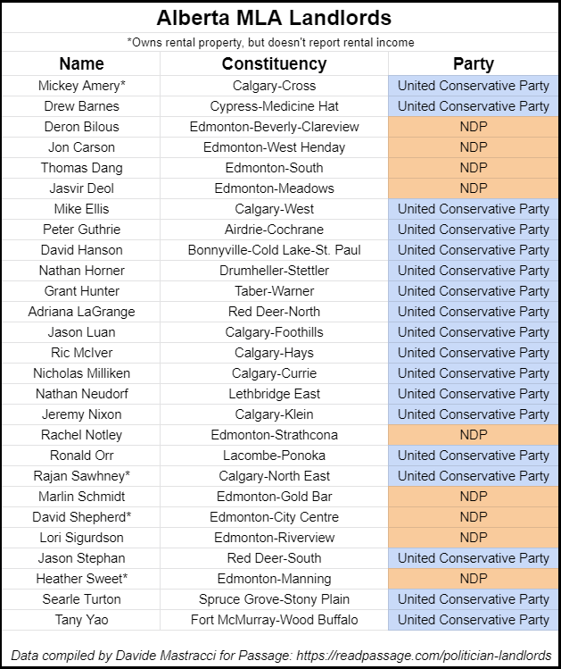 Of the 87 MLAs in Alberta, 27 are landlords, have a spouse as a landlord and/or own rental property (31 per cent). Four MLAs (Mickey Amery, Rajan Sawhney, David Shepherd and Heather Sweet) and/or their spouses have rental property, but didn’t have rental income listed. They are included in this list. Here is the party breakdown: