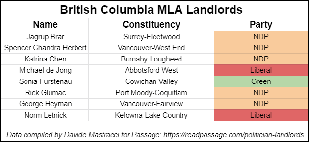 Of the 58 MLAs in British Columbia that have disclosures available, eight are landlords, or have a spouse as a landlord (13.8 per cent). Here is the party breakdown: