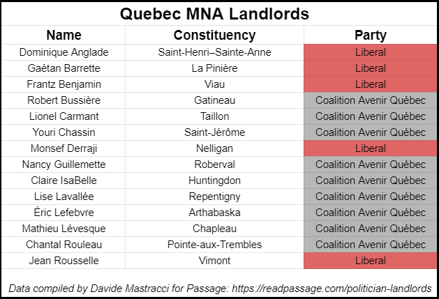 Of the 125 MNAs in Quebec, 14 are landlords (11.2 per cent). Here is the party breakdown: