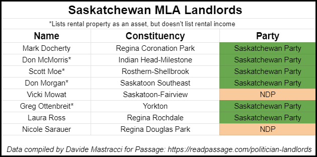 Of the 44 MLAs in Saskatchewan that have disclosures available, eight are landlords, have a spouse as a landlord, and/or own rental property (18.2 per cent). Four MLAs (Don McMorris, Scott Moe, Don Morgan and Greg Ottenbreit) didn’t have rental income listed, but they and/or their spouses were either shareholders in a numbered corporation with rental property, or the president of a company with rental property. They are included in this list. Here is the party breakdown: