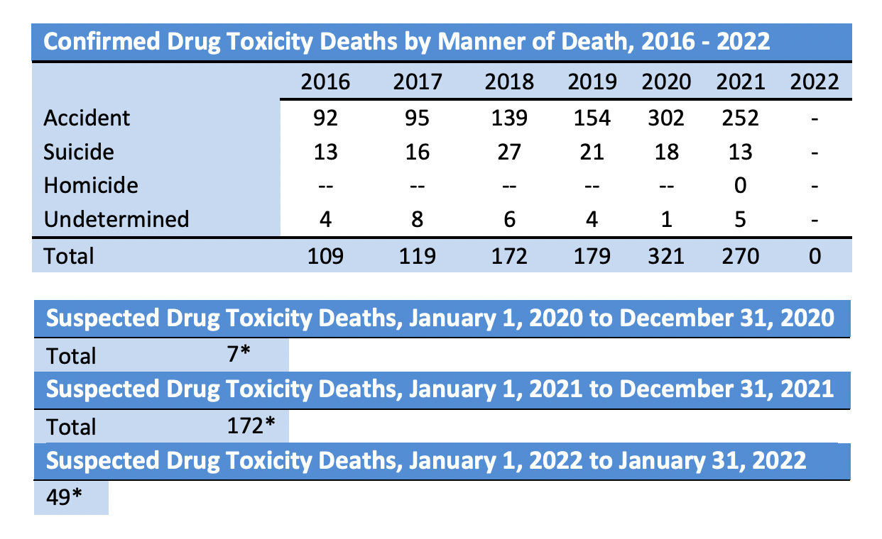 A further 172 people are suspected to have died of toxic drug overdoses last year, for a combined total of 442 overdoses in 2021, the deadliest year on record with annual fatalities trending upwards since 2016.