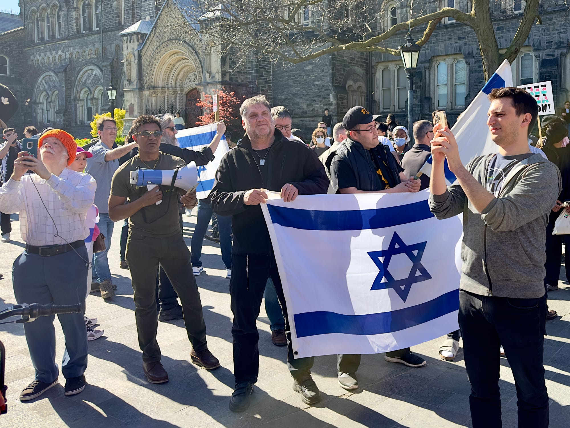 A small group of counter-protesters that included individuals identified as being members of the “Jewish Defense League” — a violent far-right organization that is listed as a terrorist group in the United States — showed up with Israeli flags at around 4 p.m.
